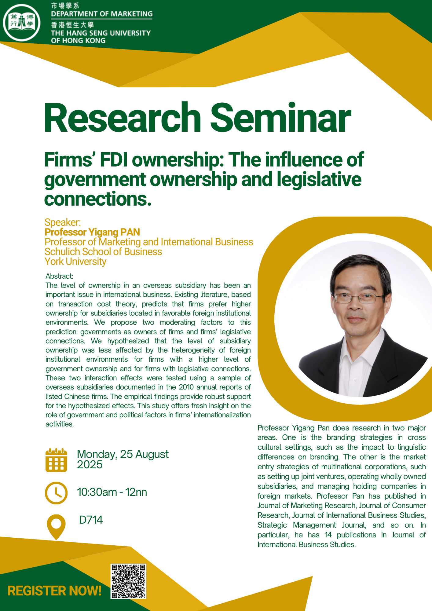 25 Aug 2025 | Firms’ FDI ownership: The influence of government ownership and legislative connections. | Prof Yigang PAN, York University | e-flyer |
