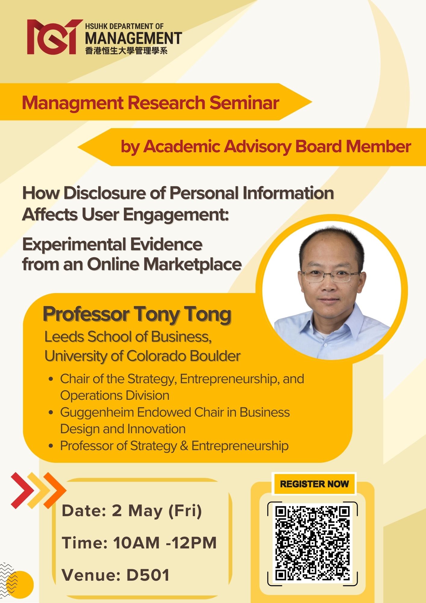 2 May 2025 | How Disclosure of Personal Information Affects User Engagement | Prof Tony Tong, Chair of the Strategy, Entrepreneurship, and Operations Division Guggenheim Endowed Chair in Business Design and Innovation Professor of Strategy and Entrepreneurship Leeds School of Business, University of Colorado Boulder | e-flyer |